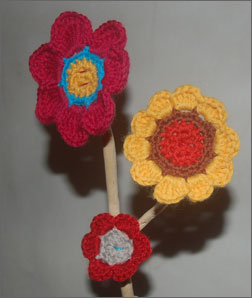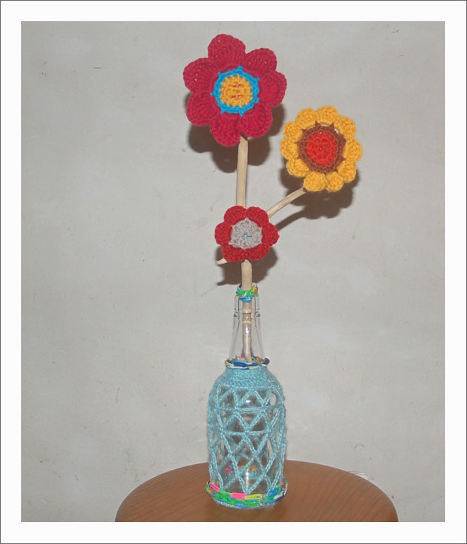 J’ai un sérieux besoin de couleur et douceur depuis le départ de mon Patou. Alors, quand j’ai vu l’article de Plumetis sur la présentation du livre de Emalisa « Motif au crochet » j’ai craqué. Le lendemain, il était dans ma boîte aux lettres et le midi, inspirée par ses motifs imprégnés de douceur, je crochetai des fleurs pour un bouquet avec du bois flotté.